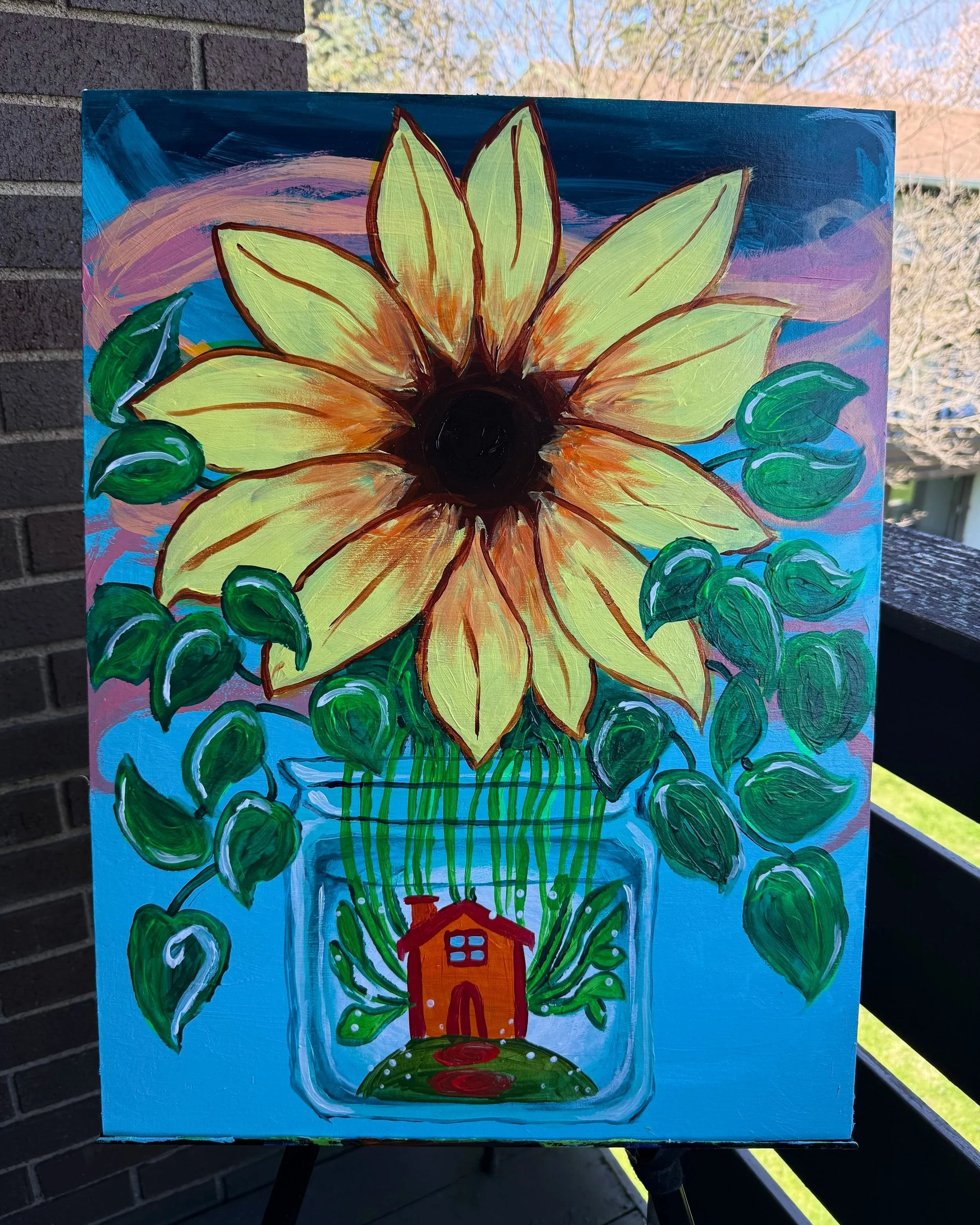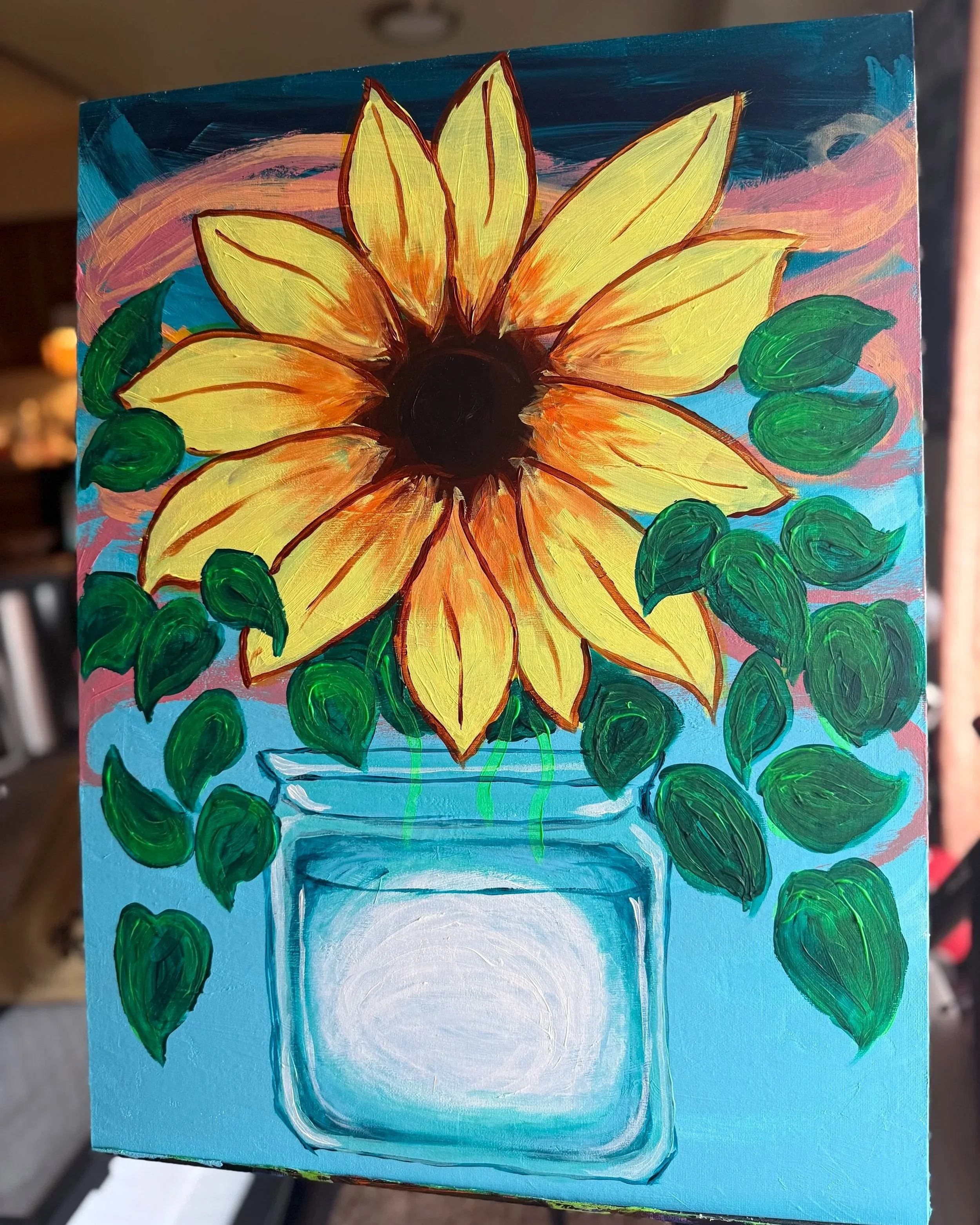 Next, the background was painted in layered tones to create depth and contrast, ensuring the sunflower would stand out as the focal point. Broad brushstrokes were used first, followed by blended layers to soften transitions.